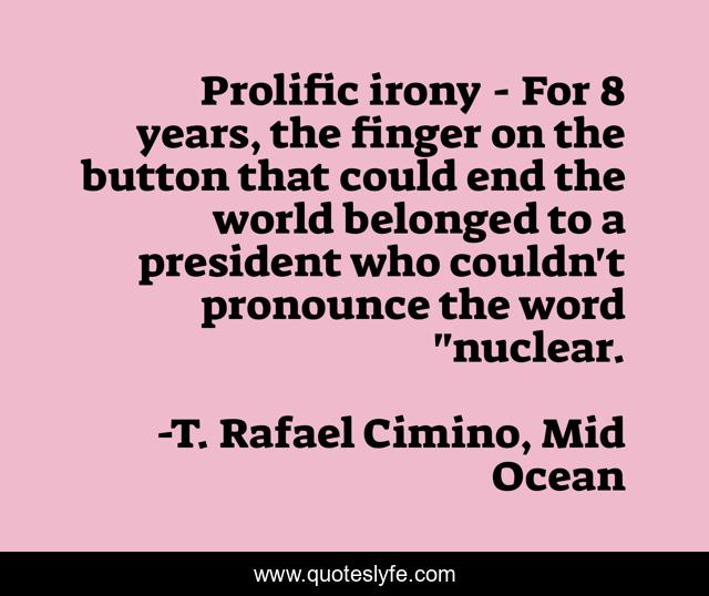 This page presents the quote "Prolific irony - For 8 years, the finger on the button that could end the world belonged to a president who couldn't pronounce the word "nuclear.". Author of this quote is T. Rafael Cimino, Mid Ocean. This quote is about george-bush, america, obama-speeches, nuclear, republicans, political, politicians, political-philosophy, americans,.