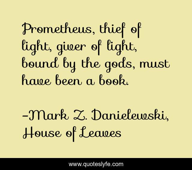 This page presents the quote "Prometheus, thief of light, giver of light, bound by the gods, must have been a book.". Author of this quote is Mark Z. Danielewski, House of Leaves. .