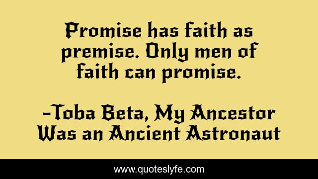 "Toba Beta, My Ancestor Was an Ancient Astronaut Quotes." Quoteslyfe.com, 2025. Fri. 05 Dec. 2025. <https://www.quoteslyfe.com/quote/Promise-has-faith-as-premise-Only-men-26002>.