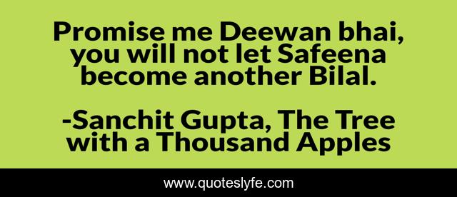 This page presents the quote "Promise me Deewan bhai, you will not let Safeena become another Bilal.". Author of this quote is Sanchit Gupta, The Tree with a Thousand Apples. .