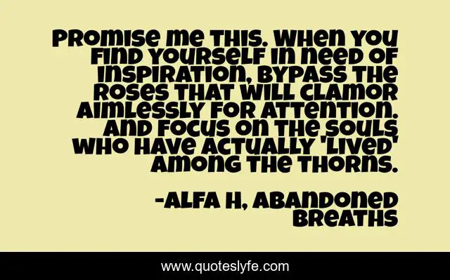 This page presents the quote "Promise me this. When you find yourself in need of inspiration, bypass the roses that will clamor aimlessly for attention. And focus on the souls who have actually 'lived' among the thorns.". Author of this quote is Alfa H, Abandoned Breaths. This quote is about life, love, poetry, encouragement, wisdom, affection, inspiration,.