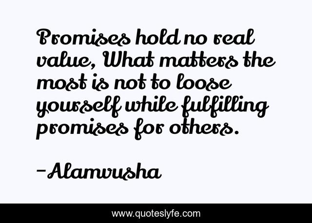 This page presents the quote "Promises hold no real value, What matters the most is not to loose yourself while fulfilling promises for others.". Author of this quote is Alamvusha. This quote is about heartbroken, promises, trust,.