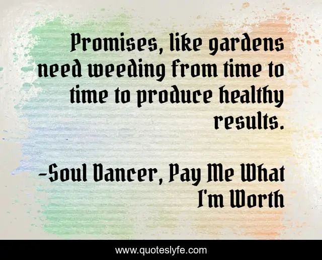 "Soul Dancer, Pay Me What I'm Worth Quotes." Quoteslyfe.com, 2025. Fri. 05 Dec. 2025. <https://www.quoteslyfe.com/quote/Promises-like-gardens-need-weeding-from-time-140093>.
