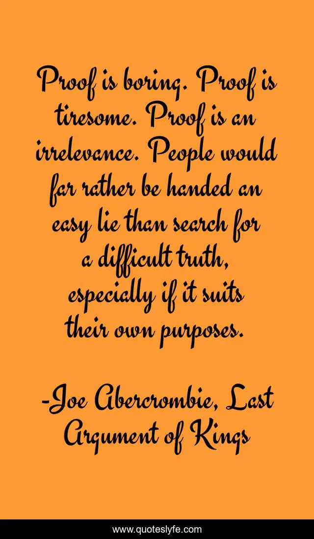 This page presents the quote "Proof is boring. Proof is tiresome. Proof is an irrelevance. People would far rather be handed an easy lie than search for a difficult truth, especially if it suits their own purposes.". Author of this quote is Joe Abercrombie, Last Argument of Kings. .