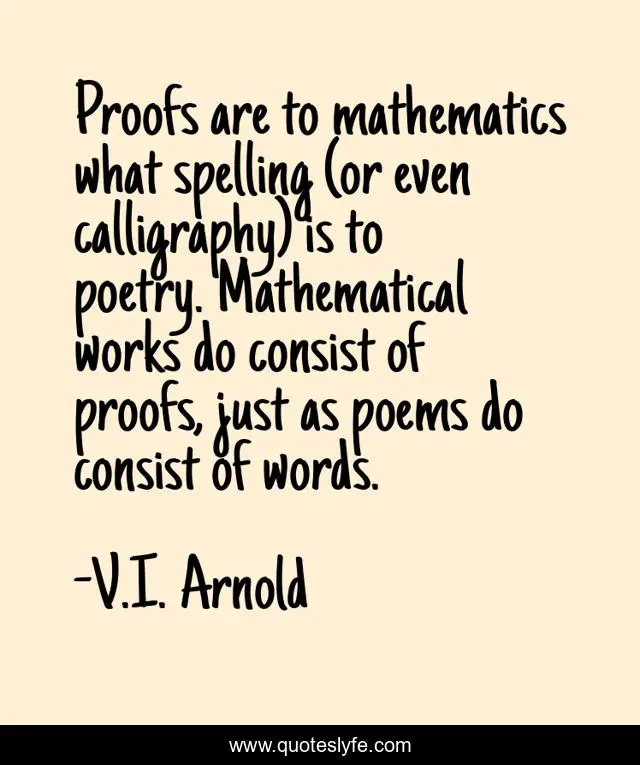 This page presents the quote "Proofs are to mathematics what spelling (or even calligraphy) is to poetry. Mathematical works do consist of proofs, just as poems do consist of words.". Author of this quote is V.I. Arnold. This quote is about mathematics, philosophy,.