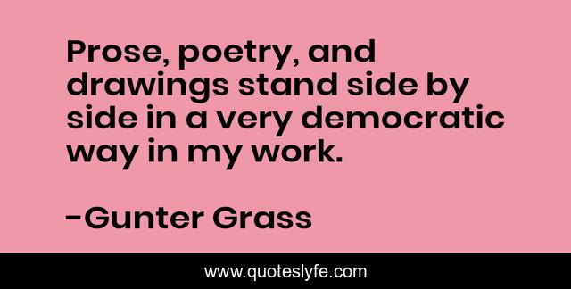 This page presents the quote "Prose, poetry, and drawings stand side by side in a very democratic way in my work.". Author of this quote is Gunter Grass. This quote is about work, stand, way,.