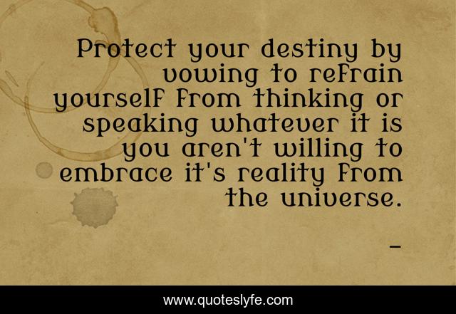 This page presents the quote "Protect your destiny by vowing to refrain yourself from thinking or speaking whatever it is you aren't willing to embrace it's reality from the universe.". Author of this quote is . This quote is about protect-your-destiny, speaking, thinking, edmond-mbiaka, the-law-of-the-universe, watch-what-you-think, refrain-yourself, thoughts, words-create-things,.