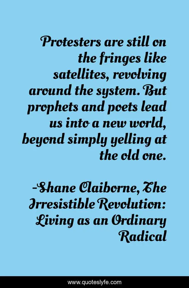 This page presents the quote "Protesters are still on the fringes like satellites, revolving around the system. But prophets and poets lead us into a new world, beyond simply yelling at the old one.". Author of this quote is Shane Claiborne, The Irresistible Revolution: Living as an Ordinary Radical. This quote is about prophets, poets, protesters, society,.