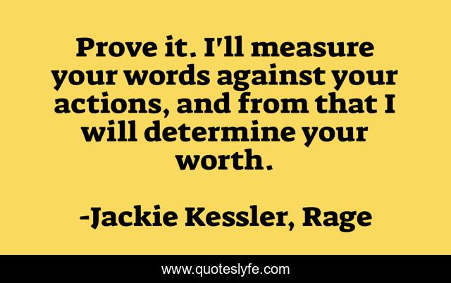 This page presents the quote "Prove it. I'll measure your words against your actions, and from that I will determine your worth.". Author of this quote is Jackie Kessler, Rage. This quote is about life, social-integrity, truths, humanity,.