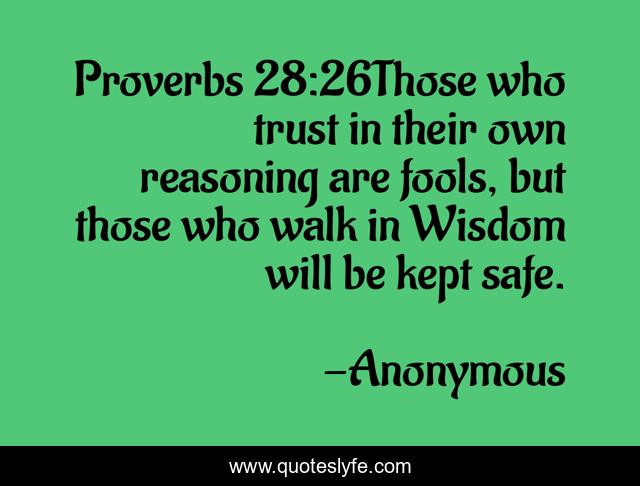 This page presents the quote "Proverbs 28:26Those who trust in their own reasoning are fools, but those who walk in Wisdom will be kept safe.". Author of this quote is Anonymous. This quote is about faith, bible, love, god, jesus, inspirational, enthusiasm, wisdom, affection,.