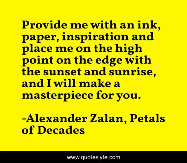 This page presents the quote "Provide me with an ink, paper, inspiration and place me on the high point on the edge with the sunset and sunrise, and I will make a masterpiece for you.". Author of this quote is Alexander Zalan, Petals of Decades. This quote is about dream, fancy, inspiration,.