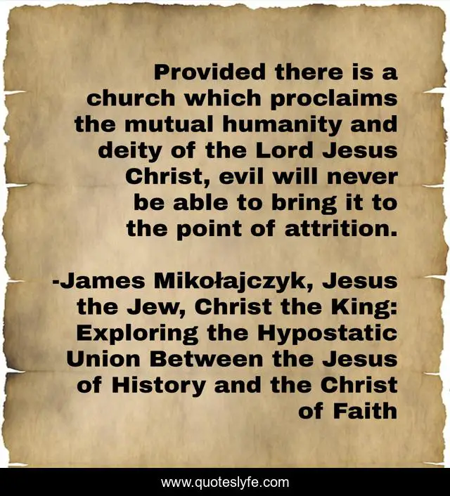 "James Mikołajczyk, Jesus the Jew, Christ the King: Exploring the Hypostatic Union Between the Jesus of History and the Christ of Faith Quotes." Quoteslyfe.com, 2025. Sat. 06 Dec. 2025. <https://www.quoteslyfe.com/quote/Provided-there-is-a-church-which-proclaims-154237>.