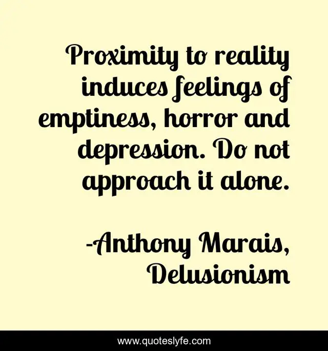 This page presents the quote "Proximity to reality induces feelings of emptiness, horror and depression. Do not approach it alone.". Author of this quote is Anthony Marais, Delusionism. This quote is about relationships, marriage,.