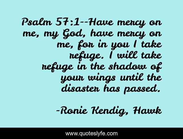 This page presents the quote "Psalm 57:1--Have mercy on me, my God, have mercy on me, for in you I take refuge. I will take refuge in the shadow of your wings until the disaster has passed.". Author of this quote is Ronie Kendig, Hawk. This quote is about god, psalm, wings, refuge, mercy,.