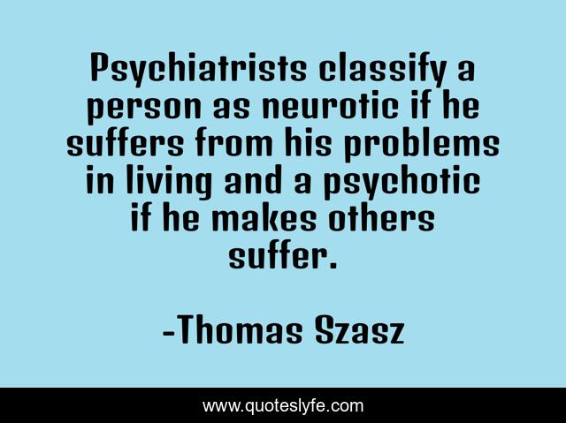 This page presents the quote "Psychiatrists classify a person as neurotic if he suffers from his problems in living and a psychotic if he makes others suffer.". Author of this quote is Thomas Szasz. .