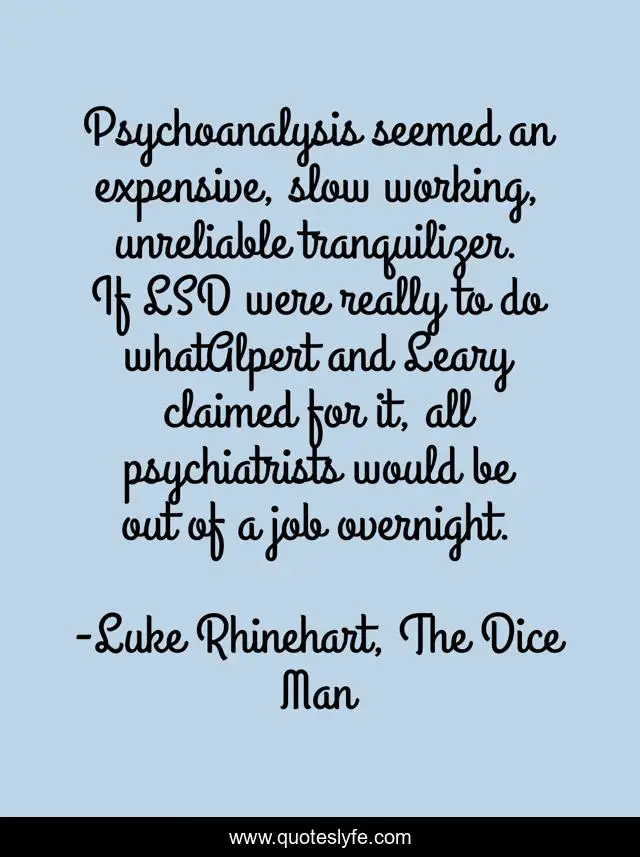 "Luke Rhinehart, The Dice Man Quotes." Quoteslyfe.com, 2025. Fri. 05 Dec. 2025. <https://www.quoteslyfe.com/quote/Psychoanalysis-seemed-an-expensive-slow-working-unreliable-228767>.