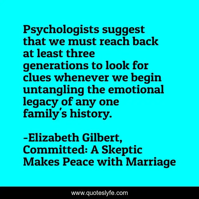 This page presents the quote "Psychologists suggest that we must reach back at least three generations to look for clues whenever we begin untangling the emotional legacy of any one family's history.". Author of this quote is Elizabeth Gilbert, Committed: A Skeptic Makes Peace with Marriage. This quote is about memoir, elizabeth-gilbert,.