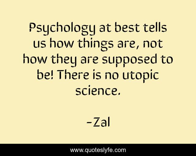 This page presents the quote "Psychology at best tells us how things are, not how they are supposed to be! There is no utopic science.". Author of this quote is Zal. This quote is about psychology, science, philosophy, mind, utopianism, utopia, utopian,.
