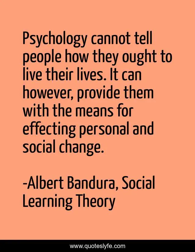 This page presents the quote "Psychology cannot tell people how they ought to live their lives. It can however, provide them with the means for effecting personal and social change.". Author of this quote is Albert Bandura, Social Learning Theory. This quote is about albert-bandura, social-learning-theory, psychology, personal-change, social-change,.
