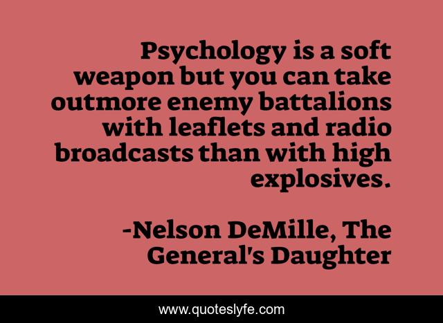 This page presents the quote "Psychology is a soft weapon but you can take outmore enemy battalions with leaflets and radio broadcasts than with high explosives.". Author of this quote is Nelson DeMille, The General's Daughter. This quote is about psychology, war,.