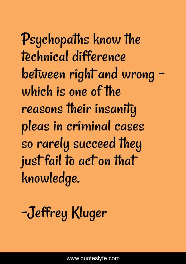 This page presents the quote "Psychopaths know the technical difference between right and wrong - which is one of the reasons their insanity pleas in criminal cases so rarely succeed they just fail to act on that knowledge.". Author of this quote is Jeffrey Kluger. This quote is about fail, insanity,.