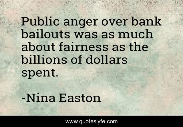 This page presents the quote "Public anger over bank bailouts was as much about fairness as the billions of dollars spent.". Author of this quote is Nina Easton. This quote is about over, bank, fairness,.
