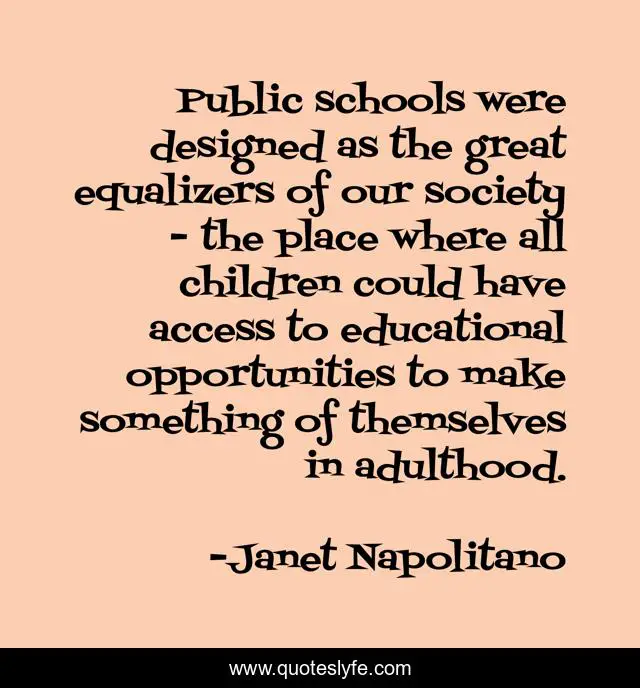 This page presents the quote "Public schools were designed as the great equalizers of our society - the place where all children could have access to educational opportunities to make something of themselves in adulthood.". Author of this quote is Janet Napolitano. This quote is about great, children,.