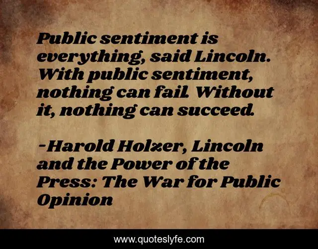 This page presents the quote "Public sentiment is everything, said Lincoln. With public sentiment, nothing can fail. Without it, nothing can succeed.". Author of this quote is Harold Holzer, Lincoln and the Power of the Press: The War for Public Opinion. This quote is about emotion, opinion, motivation, leadership,.
