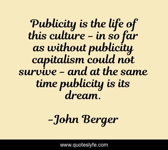 This page presents the quote "Publicity is the life of this culture - in so far as without publicity capitalism could not survive - and at the same time publicity is its dream.". Author of this quote is John Berger. This quote is about society, media, lies, culture,.