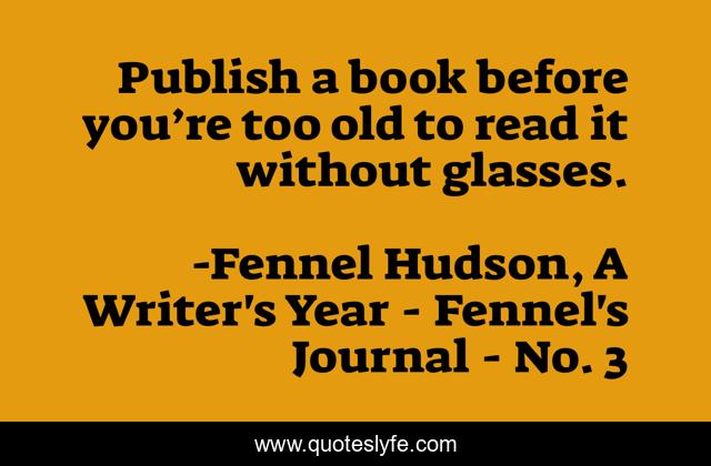 This page presents the quote "Publish a book before you’re too old to read it without glasses.". Author of this quote is Fennel Hudson, A Writer's Year - Fennel's Journal - No. 3. This quote is about writers-on-writing, writer-encouragement, writers-world, writers-life,.