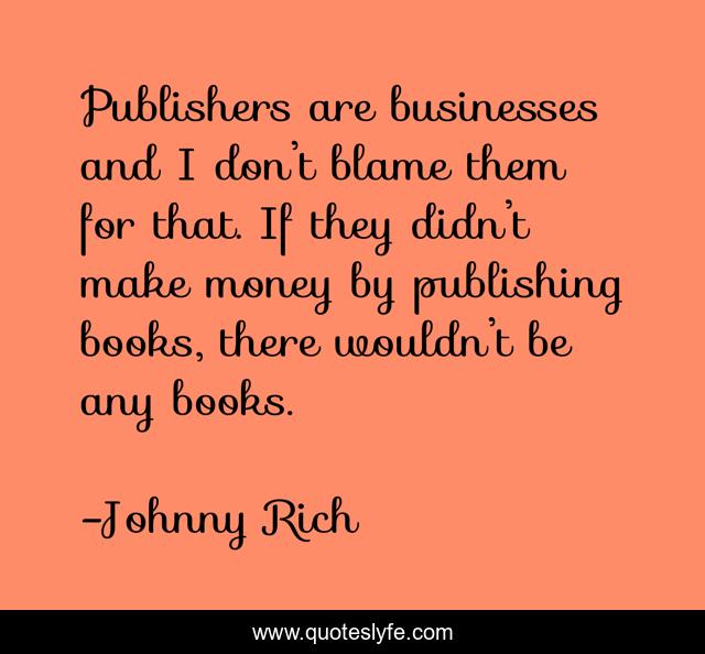 This page presents the quote "Publishers are businesses and I don’t blame them for that. If they didn’t make money by publishing books, there wouldn’t be any books.". Author of this quote is Johnny Rich. This quote is about publisher, literature, art, publishing, business, publishers, books,.