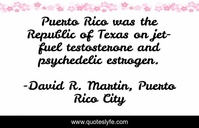 This page presents the quote "Puerto Rico was the Republic of Texas on jet-fuel testosterone and psychedelic estrogen.". Author of this quote is David R. Martin, Puerto Rico City. This quote is about puerto-rico, thriller,.