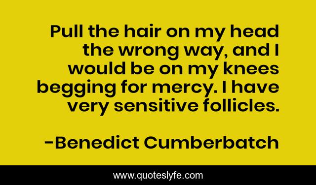 This page presents the quote "Pull the hair on my head the wrong way, and I would be on my knees begging for mercy. I have very sensitive follicles.". Author of this quote is Benedict Cumberbatch. This quote is about funny, knees, follicles, begging, hair, wrong, comedy, mercy,.