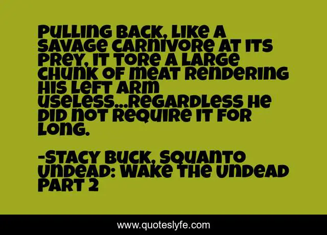 This page presents the quote "Pulling back, like a savage carnivore at its prey, it tore a large chunk of meat rendering his left arm useless...regardless he did not require it for long.". Author of this quote is Stacy Buck, Squanto Undead: Wake the Undead Part 2. This quote is about undead, zombie-horror, squanto, action-adventure, native-american, zombie-thriller, zombies, horror-fantasy,.