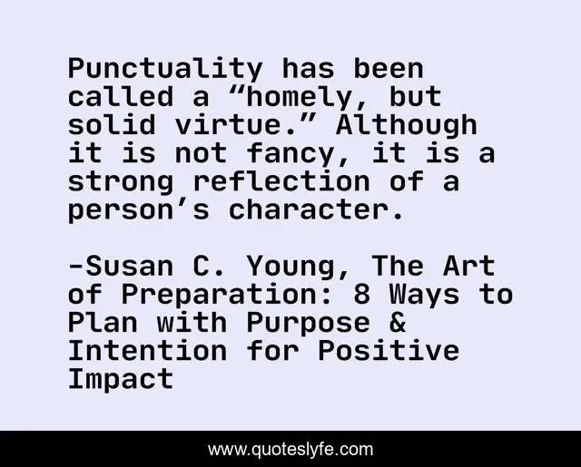 "Susan C. Young, The Art of Preparation: 8 Ways to Plan with Purpose & Intention for Positive Impact Quotes." Quoteslyfe.com, 2025. Fri. 05 Dec. 2025. <https://www.quoteslyfe.com/quote/Punctuality-has-been-called-a-homely-but-233534>.