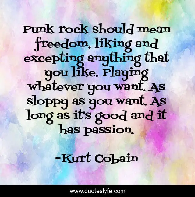 This page presents the quote "Punk rock should mean freedom, liking and excepting anything that you like. Playing whatever you want. As sloppy as you want. As long as it's good and it has passion.". Author of this quote is Kurt Cobain. This quote is about freedom, punk-rock, passion, punk,.