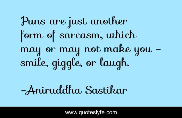 This page presents the quote "Puns are just another form of sarcasm, which may or may not make you - smile, giggle, or laugh.". Author of this quote is Aniruddha Sastikar. This quote is about giggle, pun, sarcasm, punning, laugh, joke, fun, smile, happiness,.