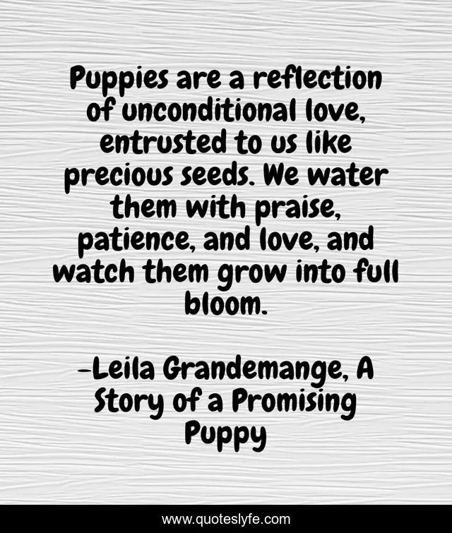 This page presents the quote "Puppies are a reflection of unconditional love, entrusted to us like precious seeds. We water them with praise, patience, and love, and watch them grow into full bloom.". Author of this quote is Leila Grandemange, A Story of a Promising Puppy. This quote is about puppy-love, raising-pups, unconditional-love,.