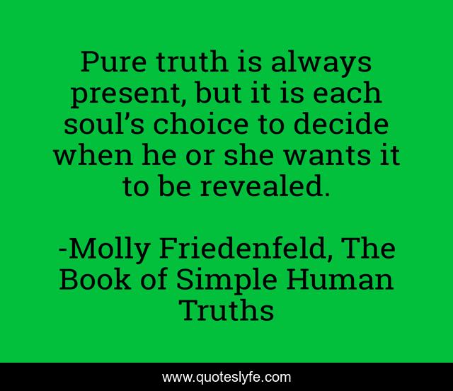 This page presents the quote "Pure truth is always present, but it is each soul’s choice to decide when he or she wants it to be revealed.". Author of this quote is Molly Friedenfeld, The Book of Simple Human Truths. This quote is about love, inspirational, joy, peace, mission, life-purpose, purpose, truth, soul,.