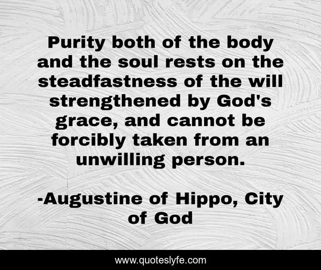 This page presents the quote "Purity both of the body and the soul rests on the steadfastness of the will strengthened by God's grace, and cannot be forcibly taken from an unwilling person.". Author of this quote is Augustine of Hippo, City of God. .