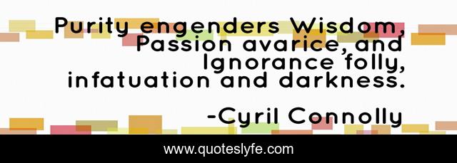 This page presents the quote "Purity engenders Wisdom, Passion avarice, and Ignorance folly, infatuation and darkness.". Author of this quote is Cyril Connolly. This quote is about passion, darkness, ignorance,.