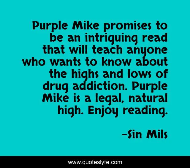 This page presents the quote "Purple Mike promises to be an intriguing read that will teach anyone who wants to know about the highs and lows of drug addiction. Purple Mike is a legal, natural high. Enjoy reading.". Author of this quote is Sin Mils. This quote is about drugs, books, young-adult, education,.
