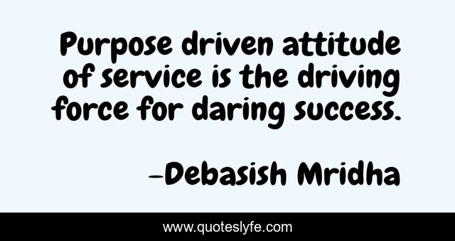 This page presents the quote "Purpose driven attitude of service is the driving force for daring success.". Author of this quote is Debasish Mridha. This quote is about attitude-of-service, success, service, debasish-mridha, philosophy, force-for-success, quotes, inspirational, enthusiasm,.