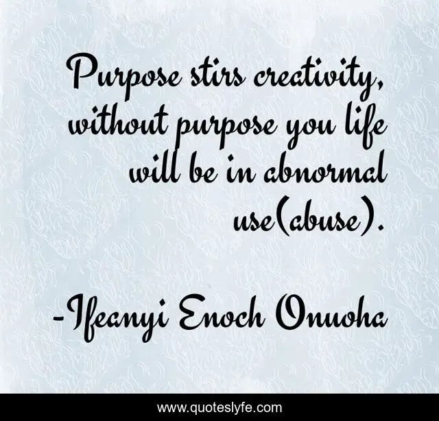 This page presents the quote "Purpose stirs creativity, without purpose you life will be in abnormal use(abuse).". Author of this quote is Ifeanyi Enoch Onuoha. This quote is about ifeanyi-onuoha, creativity, purpose, inspirational, enoch, enthusiasm,.