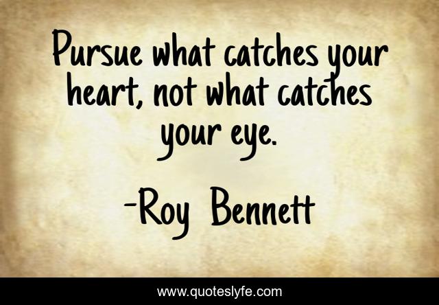 This page presents the quote "Pursue what catches your heart, not what catches your eye.". Author of this quote is Roy Bennett. This quote is about heart, life, wise, wisdom, inspirational, enthusiasm, inspiration,.