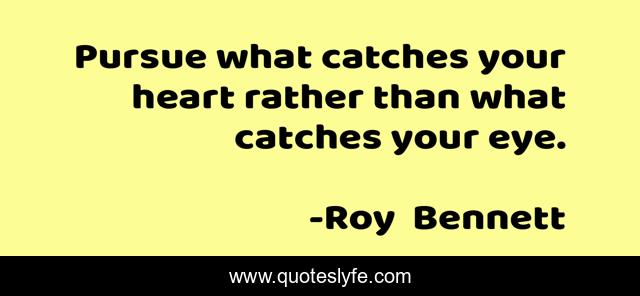 This page presents the quote "Pursue what catches your heart rather than what catches your eye.". Author of this quote is Roy Bennett. This quote is about heart, life, wise, wisdom, inspirational, enthusiasm, inspiration,.