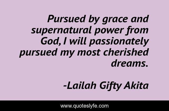 This page presents the quote "Pursued by grace and supernatural power from God, I will passionately pursued my most cherished dreams.". Author of this quote is Lailah Gifty Akita. This quote is about passionate-people, gods-will, passionate-woman, power-of-thoughts, passionate-living, dreams-inspirational, grace-of-god, passions, grace,.