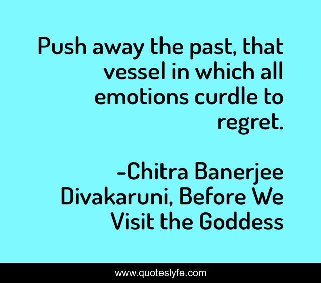 This page presents the quote "Push away the past, that vessel in which all emotions curdle to regret.". Author of this quote is Chitra Banerjee Divakaruni, Before We Visit the Goddess. This quote is about novel, mothers-and-daughters, indian-authors, wisdom, divakaruni, fiction, immigrant-experience,.