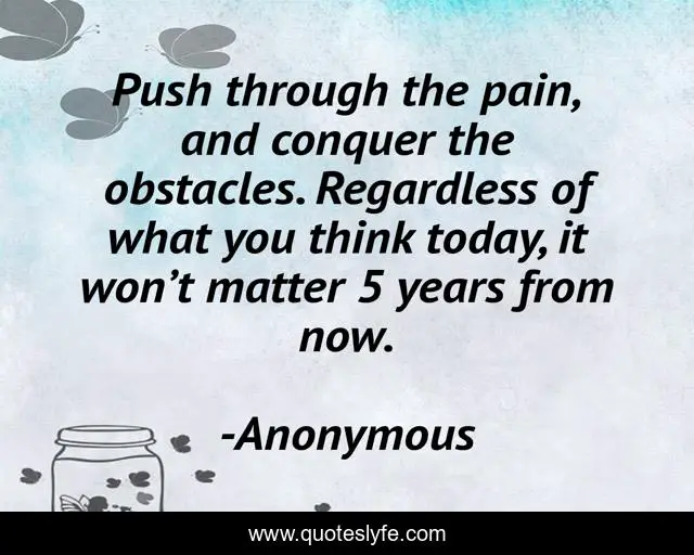 This page presents the quote "Push through the pain, and conquer the obstacles. Regardless of what you think today, it won’t matter 5 years from now.". Author of this quote is Anonymous. This quote is about pain, do-it,.