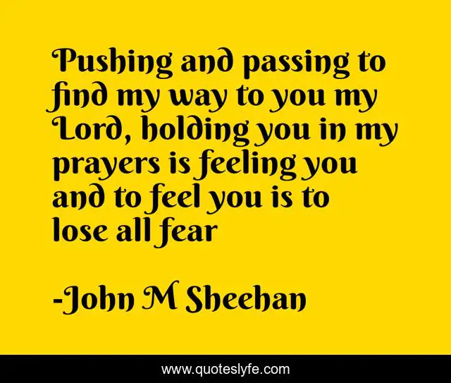 This page presents the quote "Pushing and passing to find my way to you my Lord, holding you in my prayers is feeling you and to feel you is to lose all fear". Author of this quote is John M Sheehan. This quote is about spiritualism, spirituality, spiritual-wisdom,.